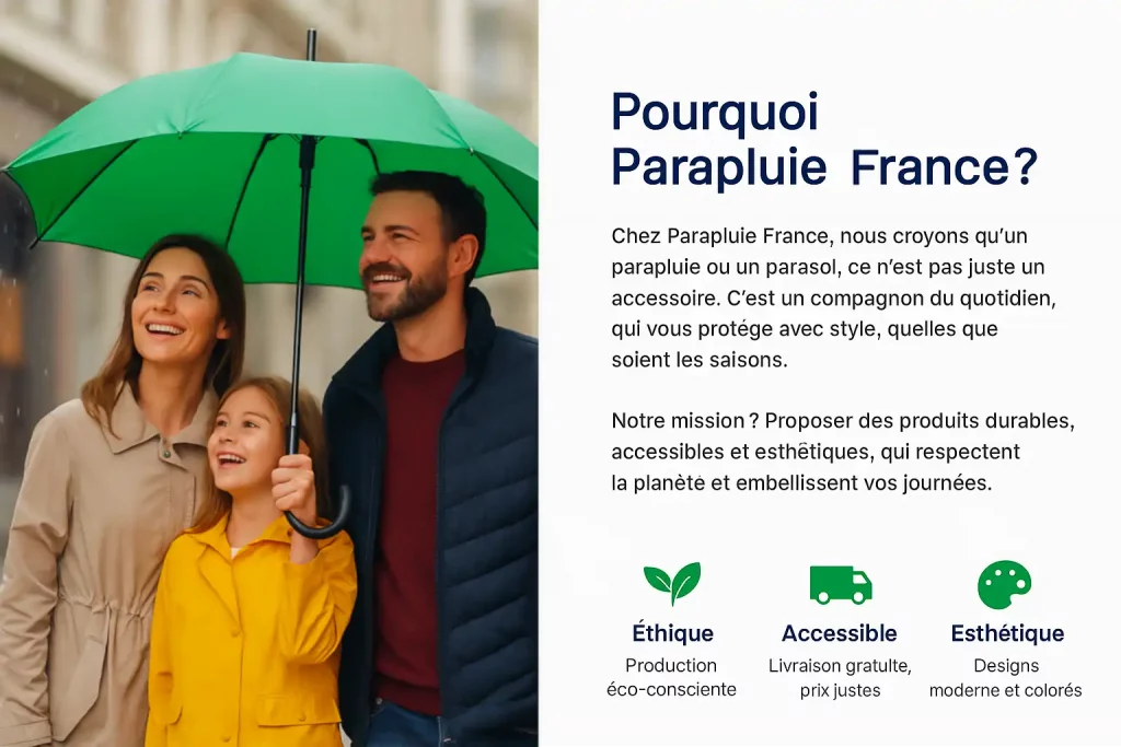 Depuis nos débuts, nous nous engageons à offrir des produits durables, élégants et adaptés à toutes les saisons. Chaque parapluie est soigneusement sélectionné pour répondre à des standards élevés de qualité, tout en restant accessible.